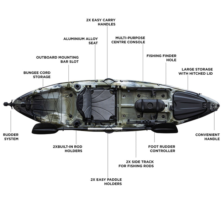 • Multi-purpose centre console for Bait, Bottle Holder & Fishing Rod Holders with a fish measuring ruler.